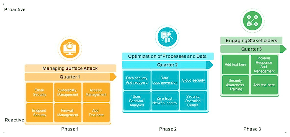 Yüzey siber saldırı yönetimini, süreç ve veri optimizasyonunu ve kurumsal büyüme için paydaş katılımını gösteren siber güvenlik stratejisi yol haritasını tasvir ediyor.
